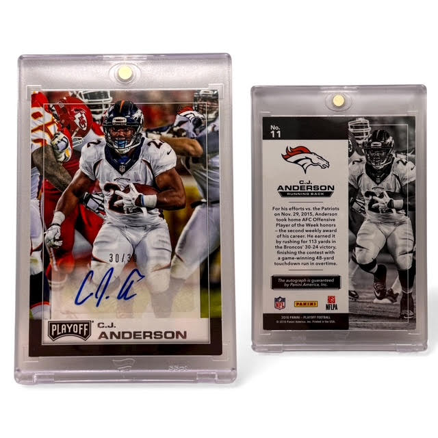 Spotlight your collection with the 2016 Panini Playoff Autograph CJ Anderson, serial‑numbered 30/30. This rare, final‑print card captures the Denver Broncos running back with an authentic signature, commemorating his impact during the team’s championship era.