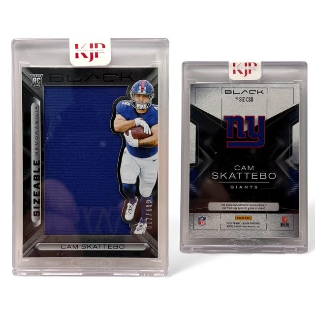 Showcase your collection with the 2025 Panini Black Football Sizeable Memorabilia Rookie Card of Cam Skattebo, serial‑numbered 12/199. This limited edition release highlights the dynamic rookie with Panini Black’s sleek design and oversized memorabilia swatch, delivering both visual impact and collectible prestige.