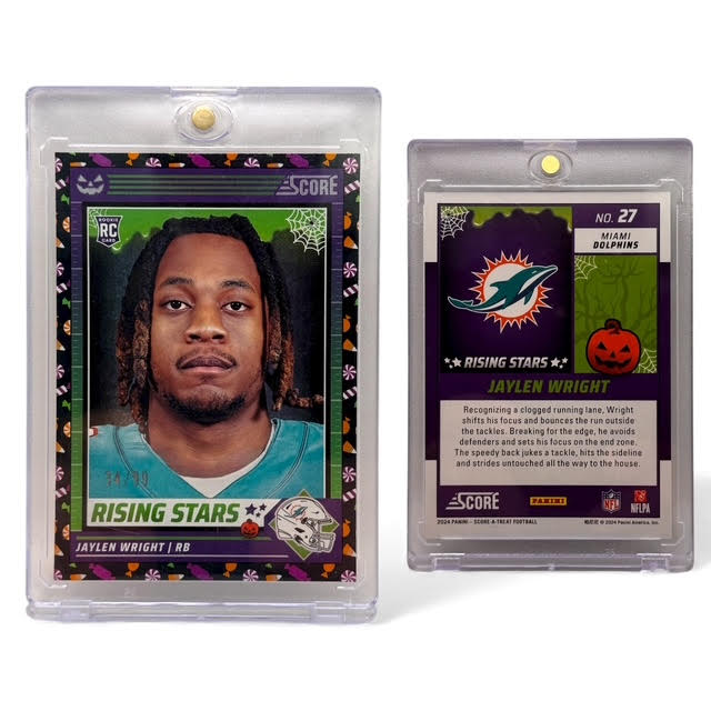 Add a festive and rare piece to your collection with the 2024 Score‑A‑Treat Candy Corn Rookie Card of Jaylen Wright, serial‑numbered 34/99. This limited‑print insert combines Score’s classic rookie design with the playful Halloween‑themed Candy Corn parallel, making it a standout addition for collectors who appreciate unique seasonal releases.