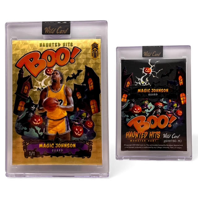 Unveil a legendary piece of basketball history with the 2025 Wild Card Haunted Hit Gold Vinyl Boo – Magic Johnson (True 1/1). This ultra-exclusive card honors the Hall of Fame icon with a dazzling gold vinyl finish and a hauntingly bold design from the Boo series.