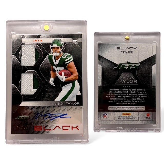 Showcase your collection with the 2025 Panini Black Football Rookie Patch Autograph of Mason Taylor, serial‑numbered 47/50. This limited edition RPA highlights the promising rookie with Panini Black’s sleek, modern design, combining a premium patch relic and bold on‑card autograph.
